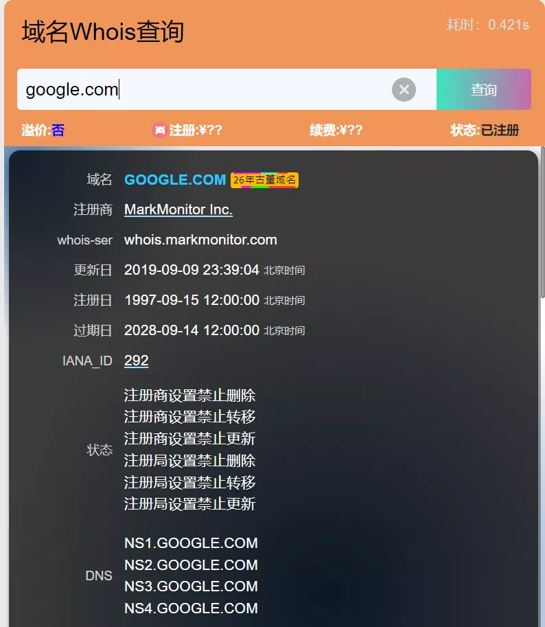 举个例子:https://whois.yiove.com/dalao.net