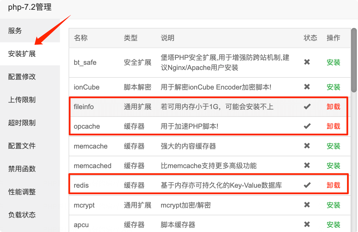 同样在这个页面。安装这三个拓展,fileinfo、redis、phpzip(如果你想正常使用导出功能得话)、opcache(可选安装,性能加强)。但就我使用,第三个拓展搜不到,所以我没有安装。