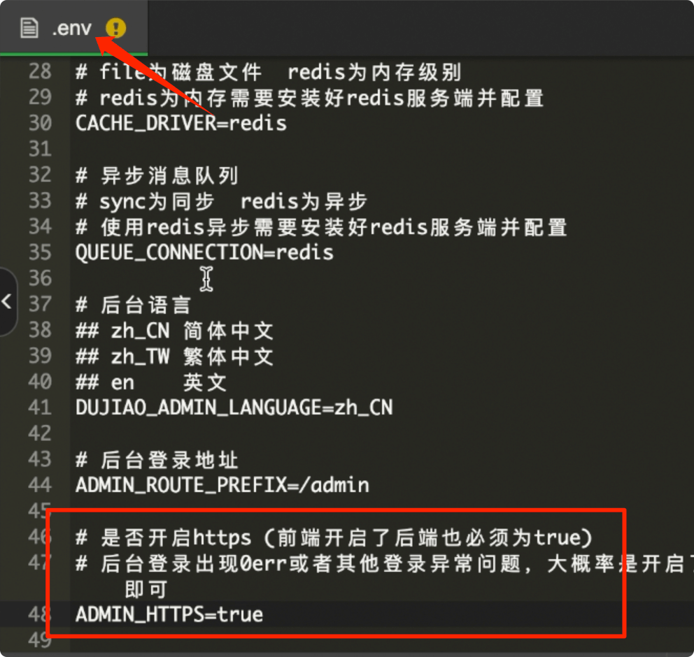 如果配置证书,开启 HTTPS,一定要修改项目目录下的.env文件。将 ADMIN_HTTPS 的值从 false 改成 true。