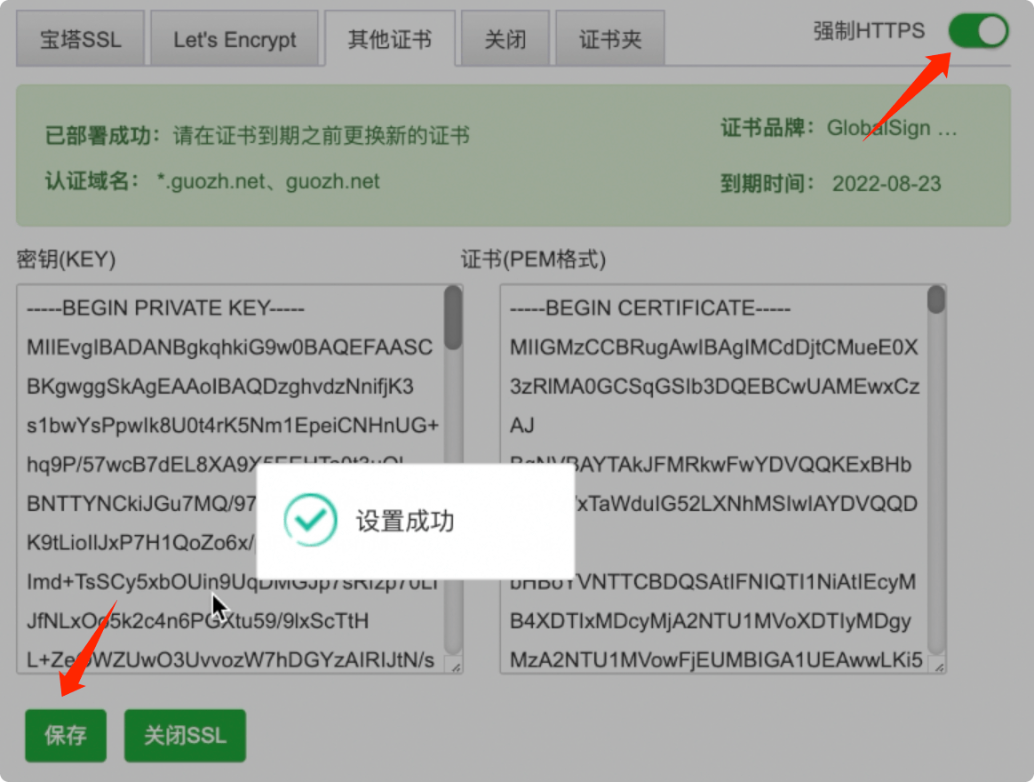 如果没有证书,可以在宝塔申请证书,如果有的话,比如在阿里云、腾讯云申请了免费的证书,可以将证书内容粘贴在【其他证书】。