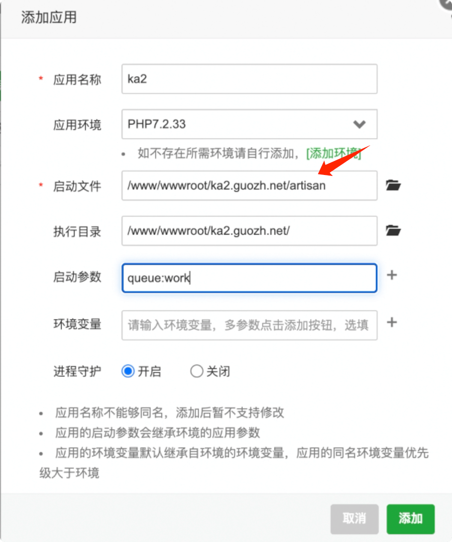 启动参数: queue:work